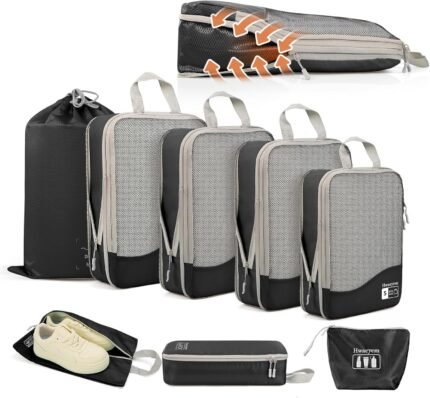 Compression Packing Cubes for Travel w/Shoe Bag (6 Piece Set) – Expandable Travel Compression Bags for Packing – Suitcases, Backpack & Luggage Compression Cubes (Black)
