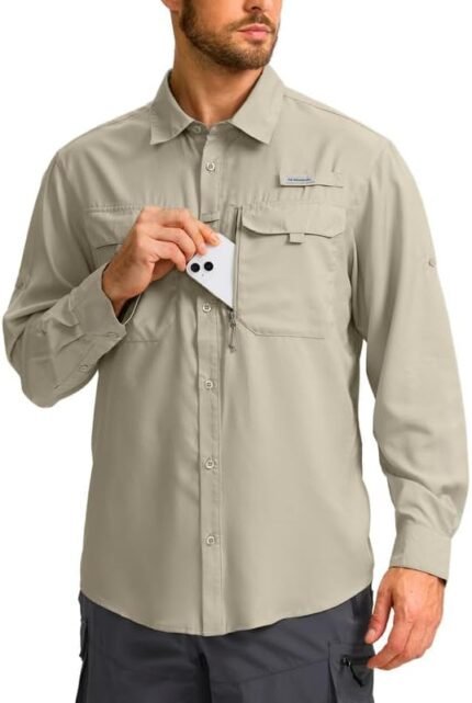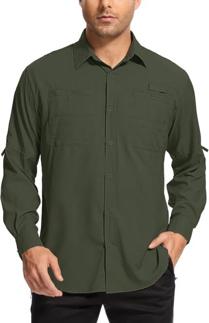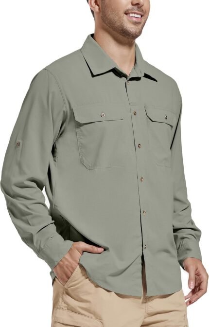 Mens Safari Shirt Long Sleeve UPF 50+ Sun Protection Fishing Shirts Men,Convertible Cuffs Hiking Shirts for Men