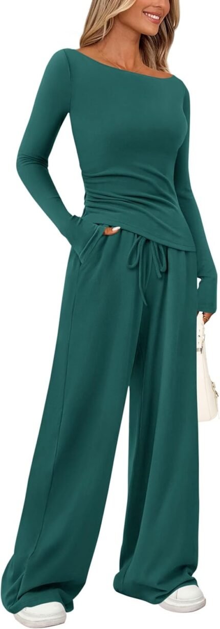 PRETTYGARDEN Women’s 2 Piece Lounge Sets Asymmetrical Long Sleeve T Shirt Wide Leg Pants Casual Outfits Tracksuit