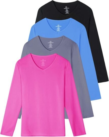 Real Essentials 4-Pack: Women’s Dry-Fit Long-Sleeve V-Neck Athletic Workout Shirt (Available in Plus Size)