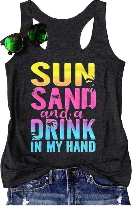 Sun Sand and in My Hand Tank Tops Womens Hawaii Summer Beach Graphic Sleeveless T Shirt Cute Country Vacation Tank Cami
