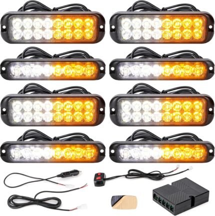 8PCS LED Amber White Strobe Lights Kit 8-LED 16-LED Sync Feature Ultra Slim Emergency Hazard Warning Flashing Caution Light Surface Mount for Construction Trucks Vehicles ATV RV Cars Waterproof