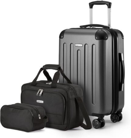 Amazon Basics 3-Piece Luggage Set, Including One Carry-On Luggage (22″ Expandable Hardside Suitcase With 8 Spinner Wheels), One 15-inch Tote Bag, and One 10-inch Compact Travel Bag, Black
