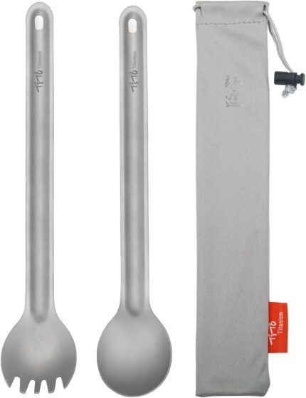 TiTo Titanium Long Handle Spork and Spoon Eco-Friendly Ultralight Portabale Flatware for Outdoor Camping Backpacking Hiking Travel Picnic Tableware with Bag (2Pcs Sandblasting)