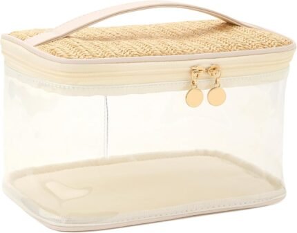Boho Straw Makeup Bag,Small Clear Travel Cosmetic Bag Aesthetic Waterproof Portable Toiletry Bag,Preppy Cute Transparent TPU Zipper Purse Travel Beach Bag sunscreen bag for Women Girl (Beige)