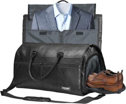 STOVER Garment Travel Duffle Bag, Large 2-in-1 Convertible Carry-on Luggage for Men & Women- Hanging Suits, Dresses & Clothes + Shoe Compartment- Weekender Tote Combo Duffel (Black Leatherette)