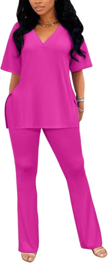 acelyn Women’s 2 Piece Outfits Summer V Neck Oversized Split Tops Flare Legging Pants Casual Tracksuit Lounge Sets Sweatsuits