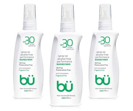 BU SPF 30 Sunscreen Spray for Face and Body, Fragrance Free, TSA Travel Size Sunscreen, Clear, Non Greasy, Water Resistant, for Sensitive Skin, 3.3 oz (3 Pack)