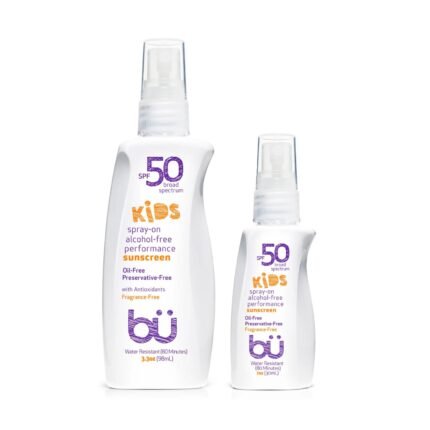 BU SPF 50 Fragrance Free Kids Sunscreen Spray for Face and Body, TSA Travel Size Sunscreen, Clear Non Aeorsol Spray, Non Greasy, Water Resistant and Oil Free, 3.3 oz and 1 oz (2-Piece Bundle)