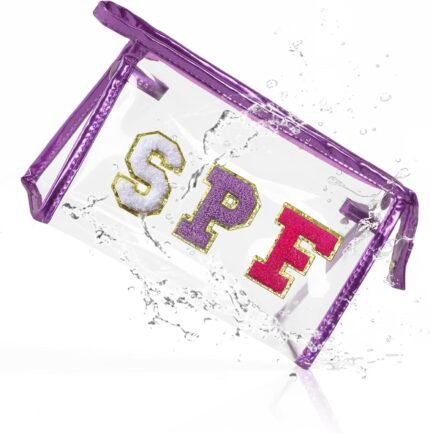 COSHAYSOO Clear Makeup Bag Preppy Sunscreen Zipper Pouch Beach Pool Travel Things Summer Stuff Traveling Cosmetic Toiletry Make Up Essential Gift for Women Teen Girl with Letter Patch Purple SPF