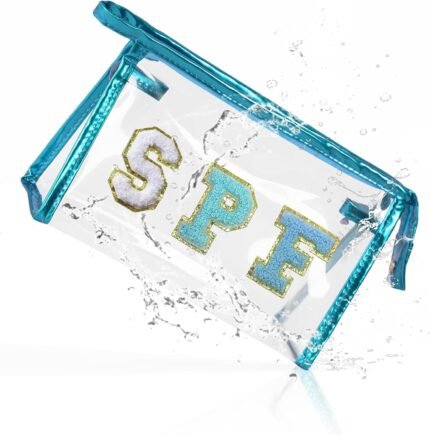 COSHAYSOO Clear Makeup Bag Preppy Sunscreen Pouch Small Beach Pool Summer Stuff Travel Must Have Cosmetic Toiletry Purse Organizer for Women Teenage Girl with Personalized Letter Patch Blue SPF