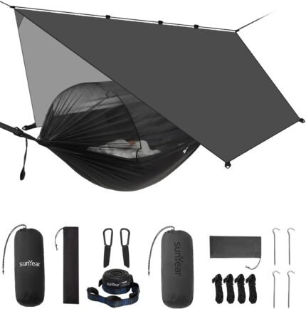 Sunyear Hammock Camping with Rain Fly Tarp and Net, Portable Camping Hammock Double Tree Hammock Outdoor Indoor Backpacking Travel & Survival, 2 Tree Straps,100% Waterproof
