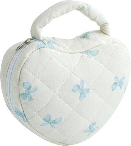 JOVAKIT Quilted Heart Shaped Makeup Bag Cosmetic Bag for Women with Handle, Floral Coquette Cotton Travel Makeup Case Toiletry Zipper Make Up Pouch, Travel Storage Organizer Stuff (Blue Bow Tie)