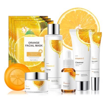 9 Pcs Travel Size Skin Care Set with Toner,Eye Cream,Facial Cleanser,Face Cream,Face Serum,Soap,Orange Face Masks,Hydrating Face Wash Skincare Care Kit for All Skin Types