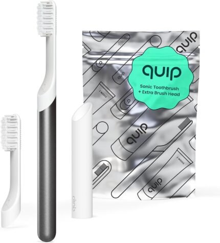 Quip Sonic Toothbrush for Adults with Timer – Includes Extra Brush Head and Travel Cover Mount – Electric, Soft Bristle Refill Head, Metal Handle, 3 Month Battery Life – Travel Toothbrush – Slate