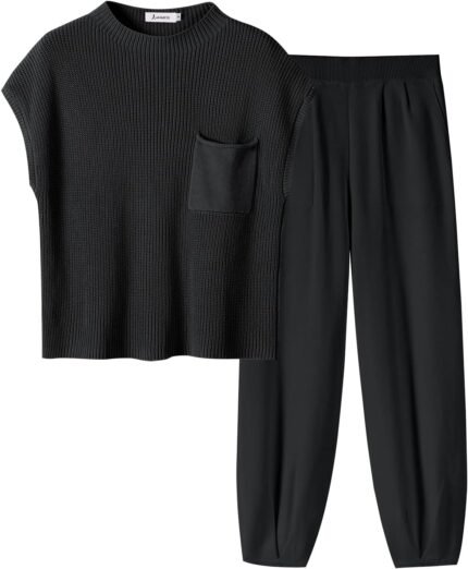 ANRABESS Women’s Two Piece Outfits Knit Sweater Vest Crop Top Pants Lounge Matching Tracksuit Sweatsuit Travel Clothes Sets