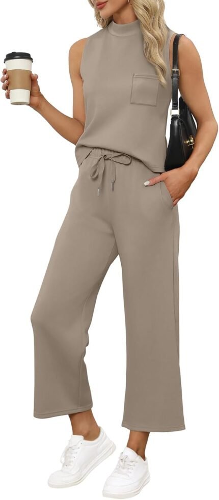 WIHOLL 2 Piece Sets for Women Summer Travel Vacation Outfits Casual Mock Neck Wide Leg Crop Pants Lounge Sets