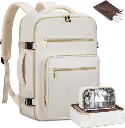 LOVEVOOK Travel Backpack for Women,40L Carry On Backpack Flight Approved,TSA Personal Item Travel Bag Fits 17.3″ Laptop with 3 Packing Cubes,Large Waterproof Weekender Daypack,Beige and khaki