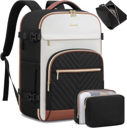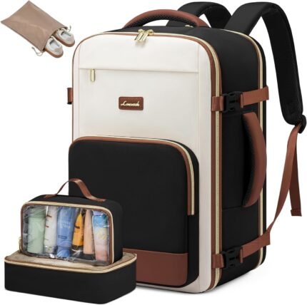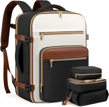 LOVEVOOK Travel Backpack for Women,40L Carry On Backpack Flight Approved,TSA Personal Item Travel Bag Fits 17.3″ Laptop with 3 Packing Cubes,Large Waterproof Daypack,Beige and black and brown
