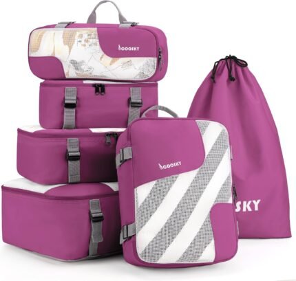Compression Packing Cubes for Suitcases, COOSKY 6 Set Transparent Clothes Organizer for Travel Essentials, Expandable Storage Bags in Luggage, Carry on Size Travel Accessories for Women/Men, Purple