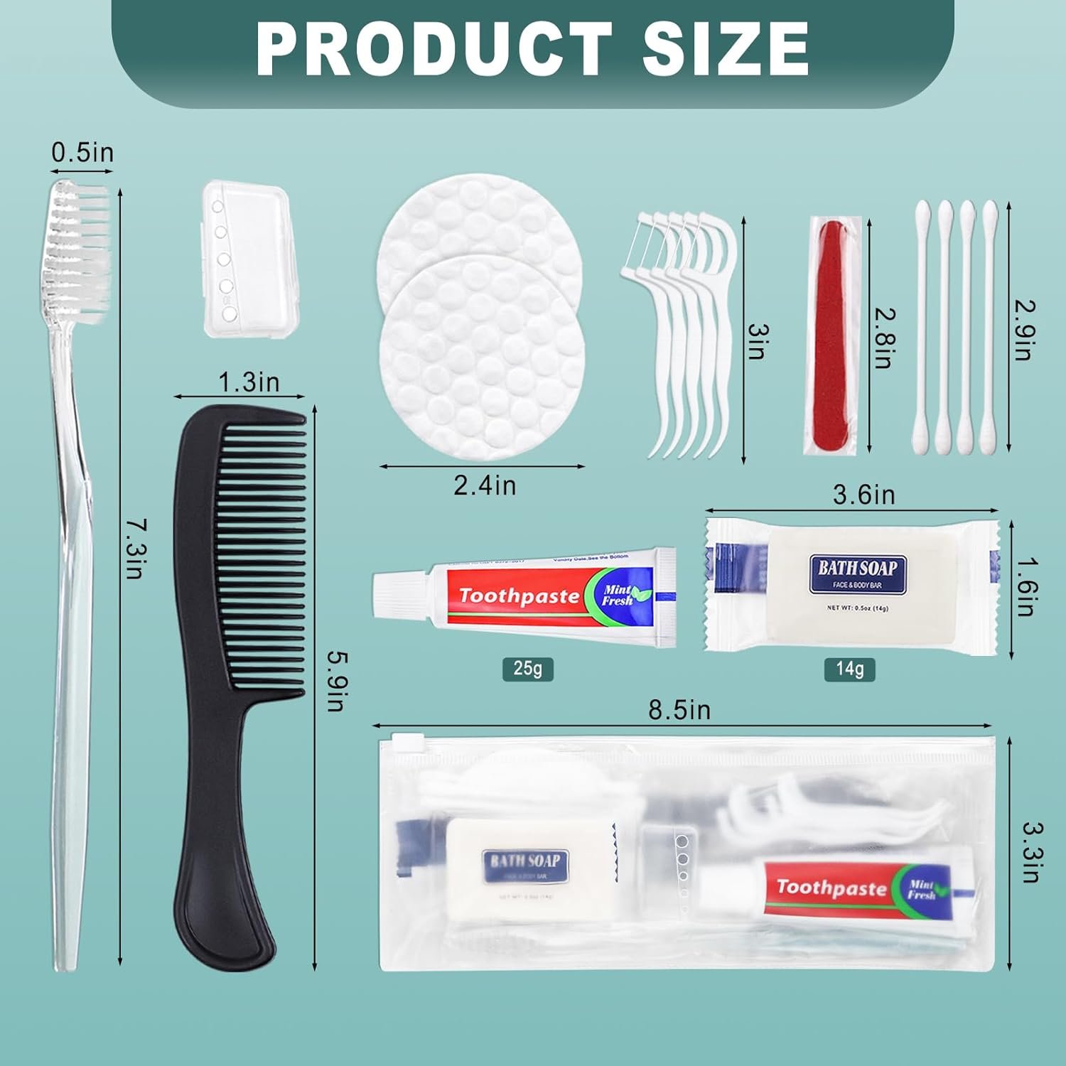 🚀【10 Comprehensive Hygiene Kits】 8-IN-1 travel toiletry kit. Each package includes 1*soap(14g/0.5oz), 1*toothbrushes, 1*toothpastes(25g/0.88oz), 1*combs and 5*floss picks, 1*Cover, 1*Vanity Kit(4*cotton swabs,2*cotton pads,1-nail file). Each kit is packaged in a reusable zipper bag.