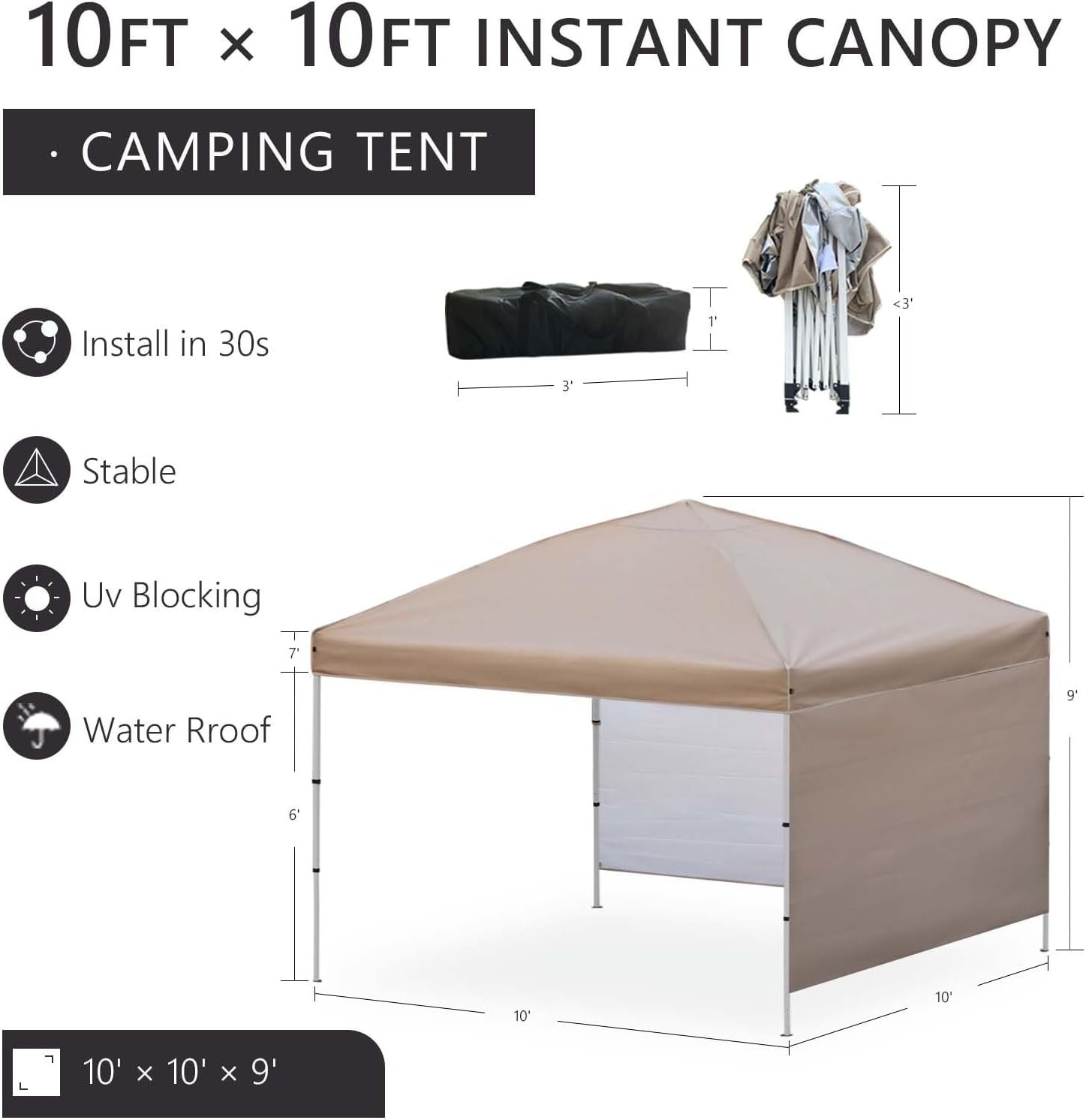 WIDE RANGE OF SHADING:Our 10′ x 10′ awning provides 100 square feet of shade,and over 9’4”maximum interior height, big enough to accommodate 6-10 people. Not only does it provide plenty of standing room, but you can also place tables, benches, and other camping gear inside. Allow your family and friends to enjoy the outdoors in a relaxing and enjoyable way.Allow your family and friends to enjoy the outdoors at their leisure.
