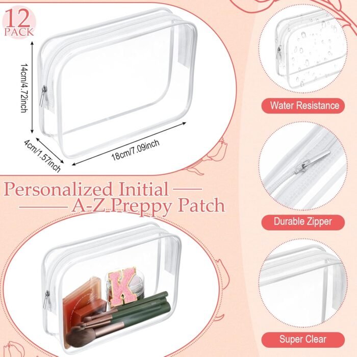 Makeup Bags with Chenille Patches: this package comes with 12 pieces clear toiletry bags with 1 set of A-Z letter patches, additional 6 popular letters (A, M, K, S, E, J); The quantity is sufficient for your own use and enough to share with family and friends