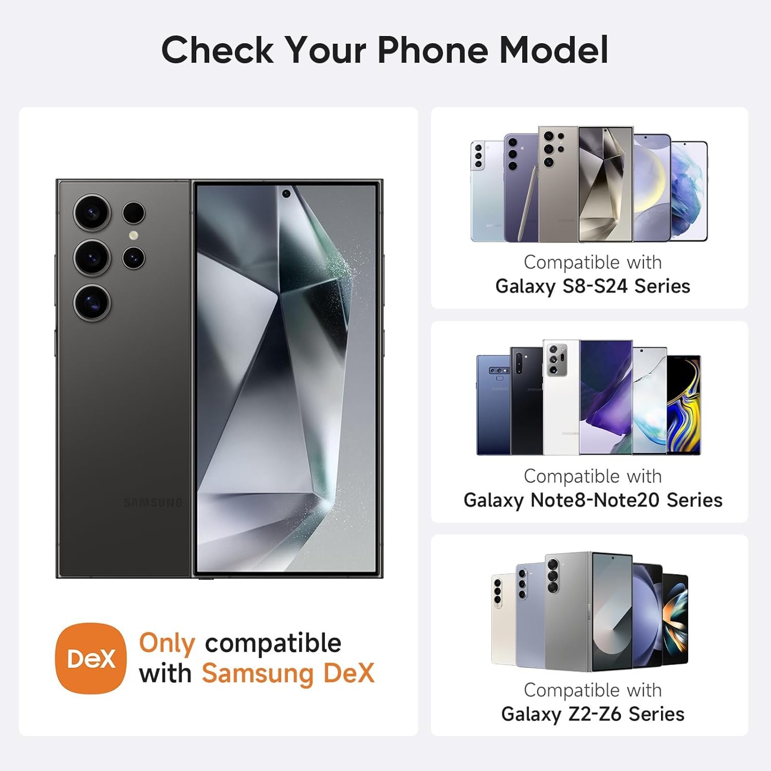 Compatible with: Galaxy S8-S24 (including + and Ultra), Note 8-20 (including Ultra), Z Fold 2-6. For other models, if “Samsung DeX Support: Yes” is shown on Samsung’s website, it’s compatible. Unsure? Send us your model and we’ll check for you.
