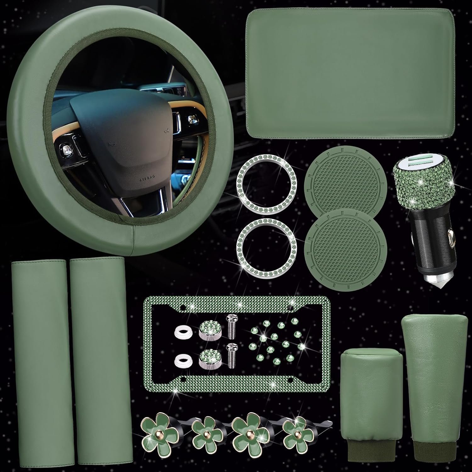 15 Pcs Bling Car Accessories Set Leather Steering Wheel Cover Seatbelt Cover Car Ring Sticker Center Console Pad USB Port Flower Air Vent Clip(Green)