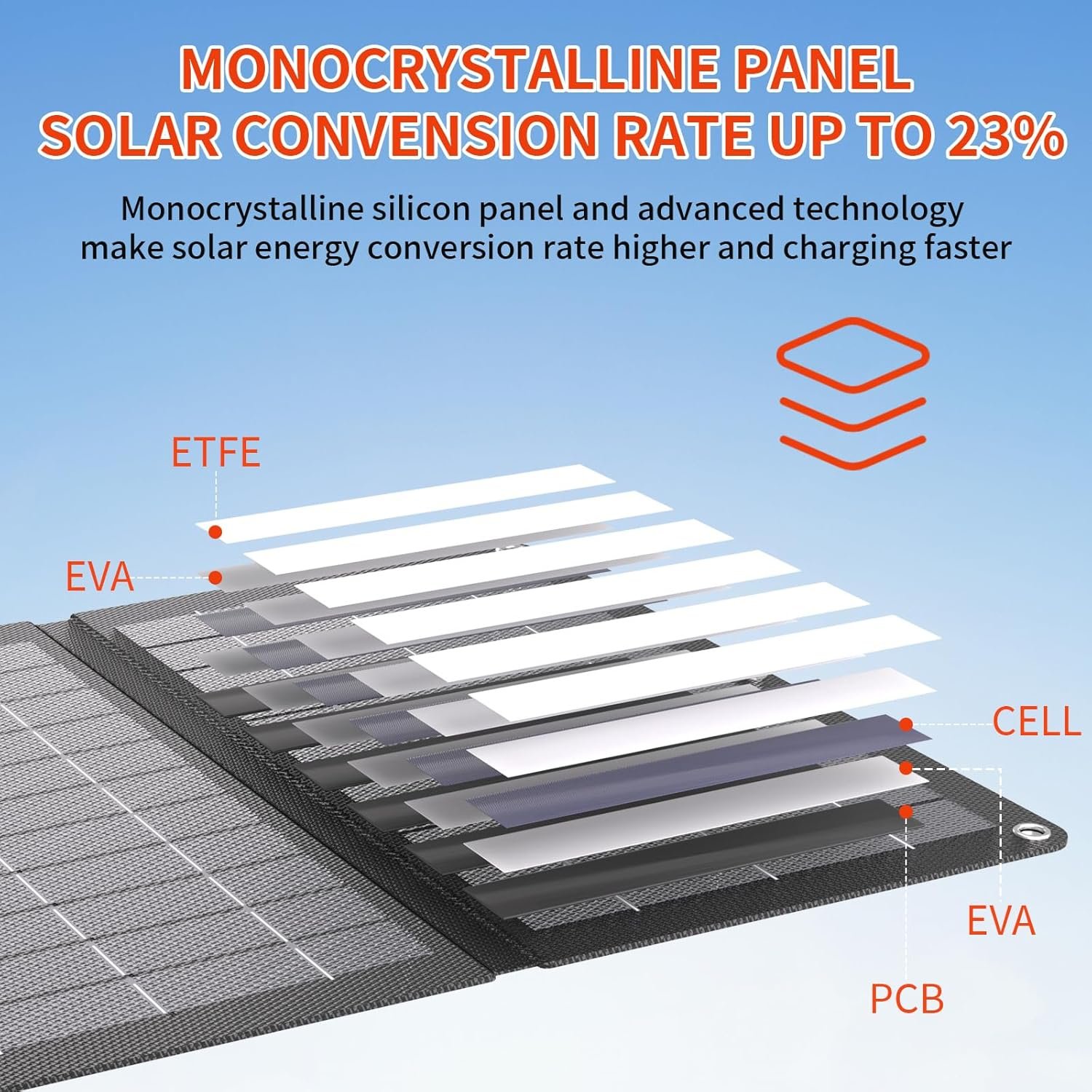 Get Power Anywhere Under the Sun:This solar panel charger boasts a remarkable 23% conversion efficiency, thanks to its advanced ETFE coating and clever surface design. The high light transmittance ensures maximum exposure to sunlight, while the increased contact area with the sun boosts energy conversion rates. Enjoy limitless green power for all your devices whenever the sun is shining