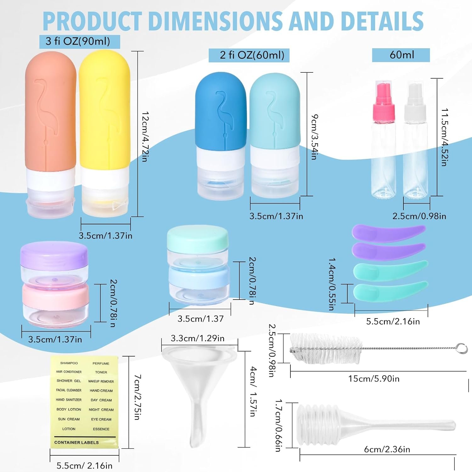 Package Contents: Travel bottle set includes 4 travel bottles, 4 travel jars, 2 spray bottles, 2 spoons, 1 small funnel, 1 small dropper, 1 cleaning brush and 1 label, and 1 A transparent black cosmetic bag. Diverse containers can carry different toiletries and cosmetics according to your needs