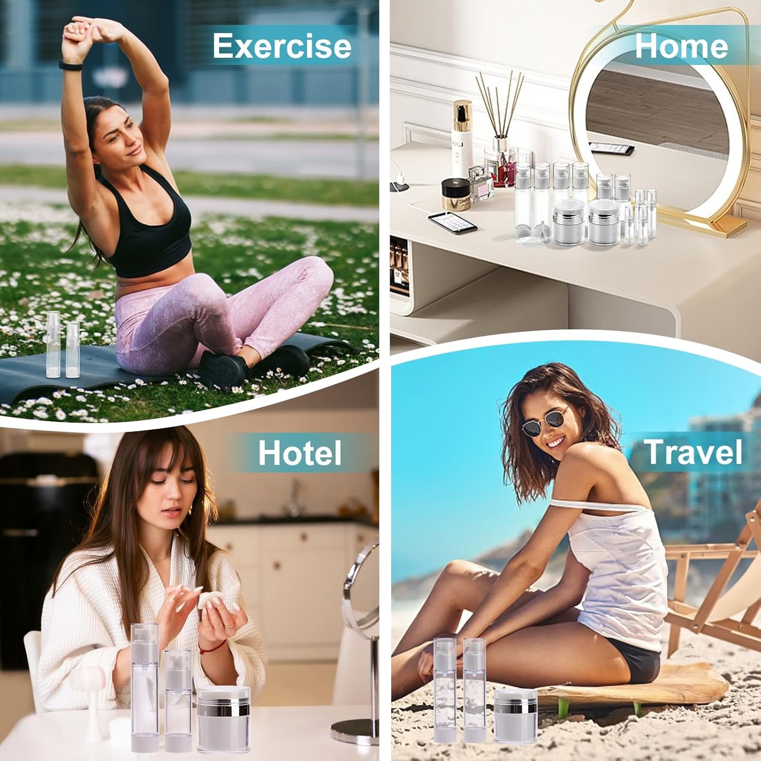 【Refillable Airless Pump Jars】Bubimon 18 Pack reusable airless pump jars: 2pcs cream jars (50ml-1.7 floz), 8pcs bottles (2×50ml-1.7floz + 2×30ml-1floz + 2×10ml-0.34floz+ 2×5ml-0.7floz) , 2pcs spray bottles(50ml-1.7 floz), 2pcs funnels, 2pcs labels , 2pcs spatulas.