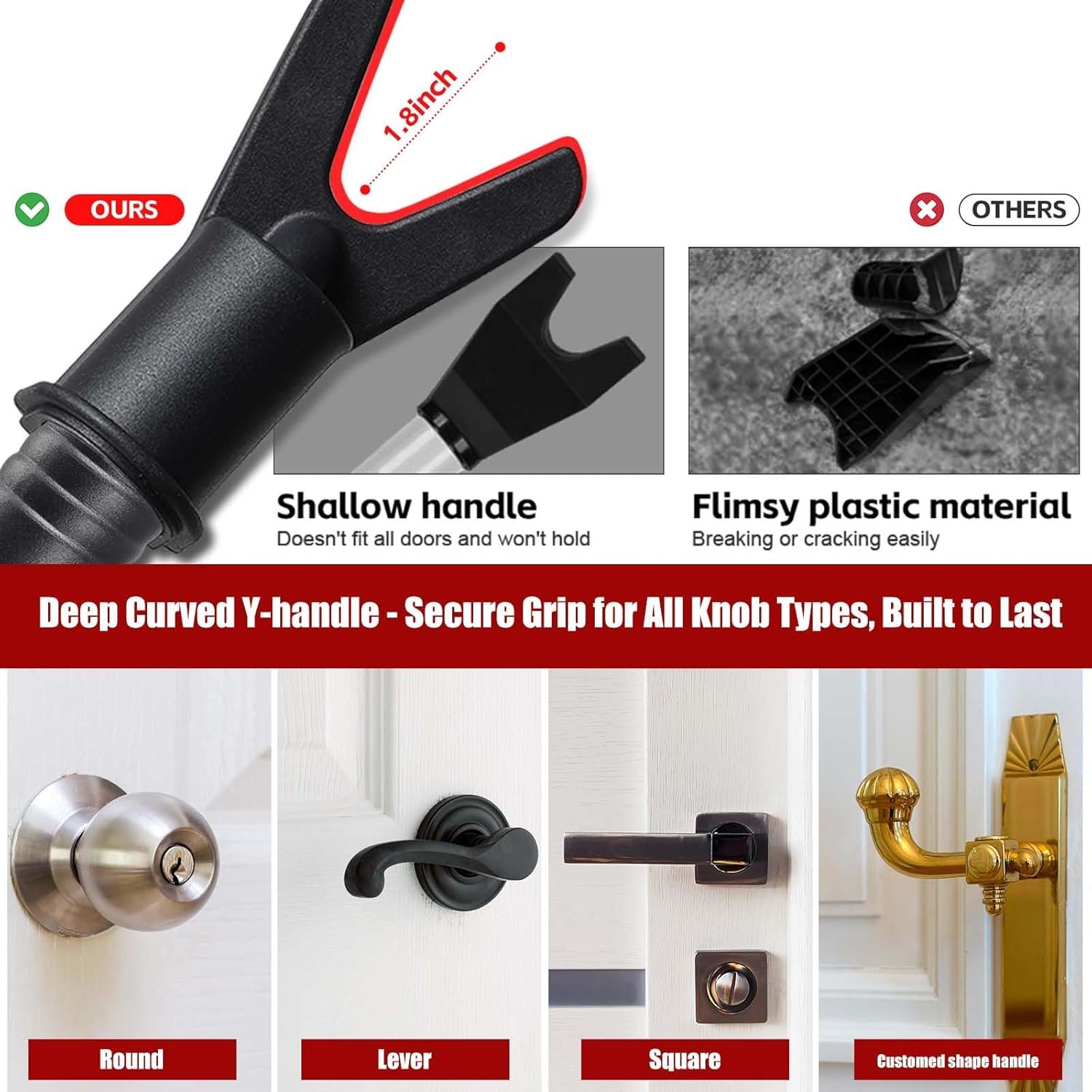 Universal Fit Handle,Stays Locked,Won’t Break :Better than shallow,flimsy plastic handles,our deep curved Y-handle firmly into place on all knob types – whether round, lever or custom shaped. Made of premium ABS plastic,it’s tough, impact-resistant, and built to last. Even during high-force events, door jammer won’t bend or break, giving you reliable security at all times