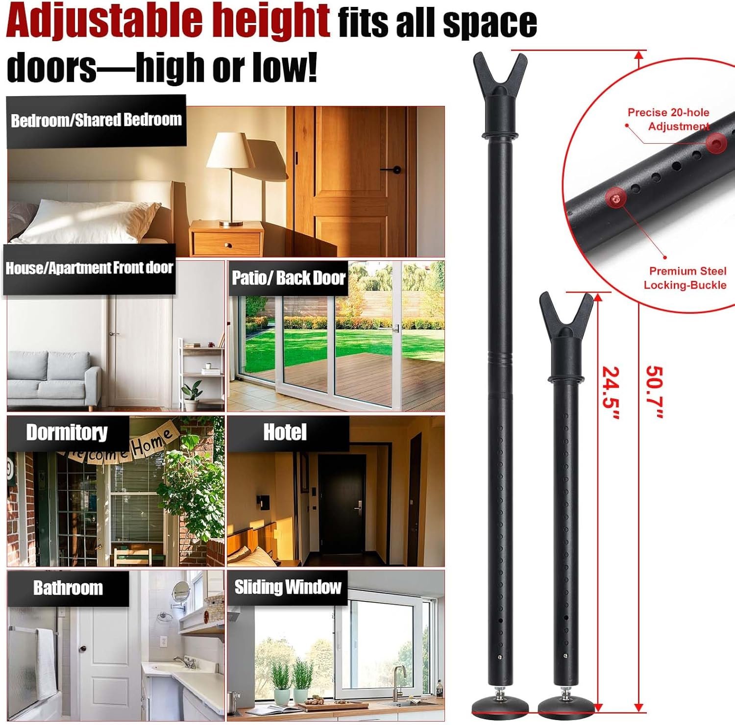 Flexible Adjustable Length,Easy Fit for Doors High or Low:Adjustable telescopic burglar bar with 20 precision setting holes has a range of 24.5-50.7”ensures a perfect fit for any door length,Making it ideal for homes, hotels, dorms, apartments, sliding patio doors,and RVs. Lock your door with confidence and feel safe anytime, anywhere