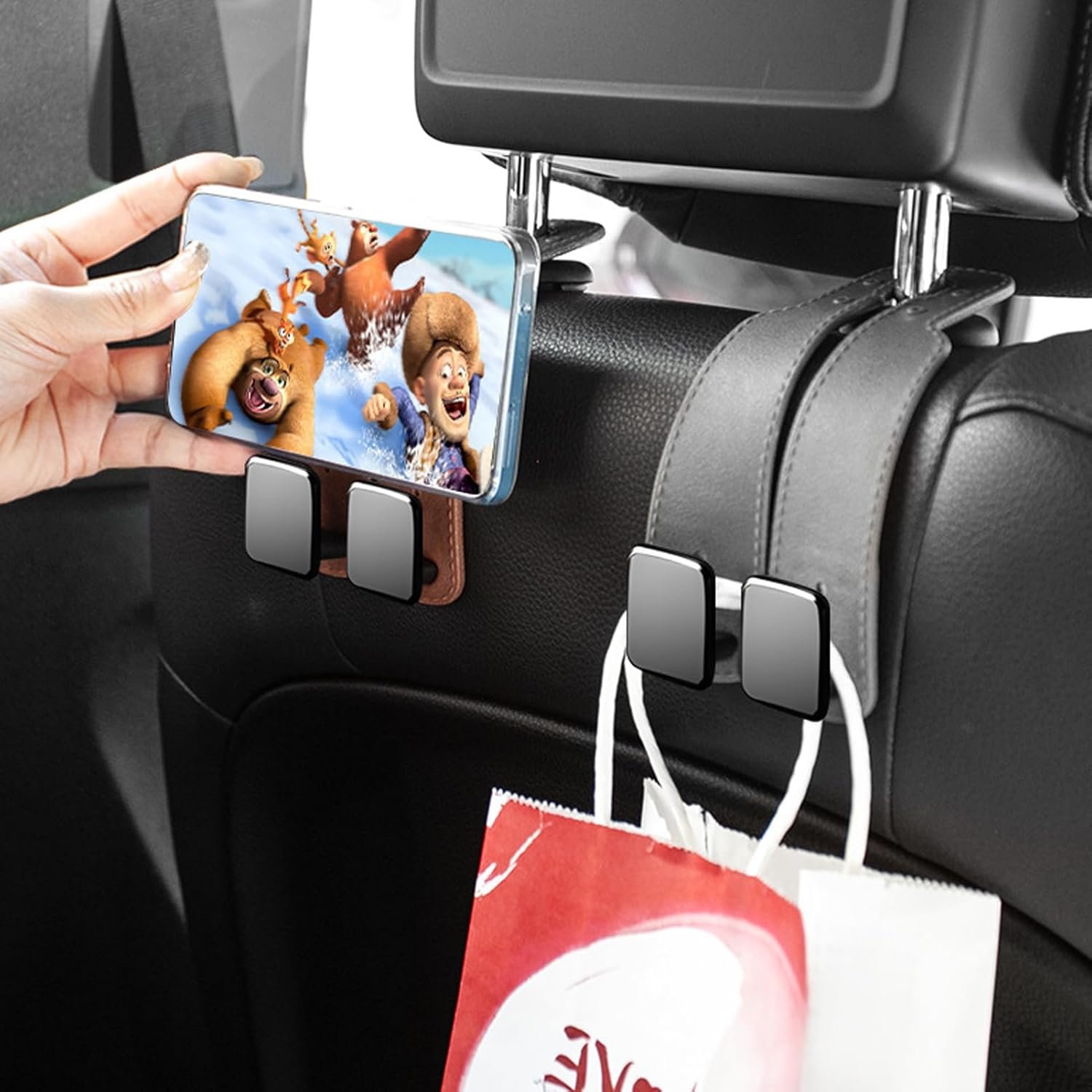 【Effective Space Saving】Say goodbye to the mess that your purses, bags or other belongings that cause to your car, this double hooks do not only helps organize your car but also are phone holder, double hooks design can hang more things so that adding more space for a cozy car life.