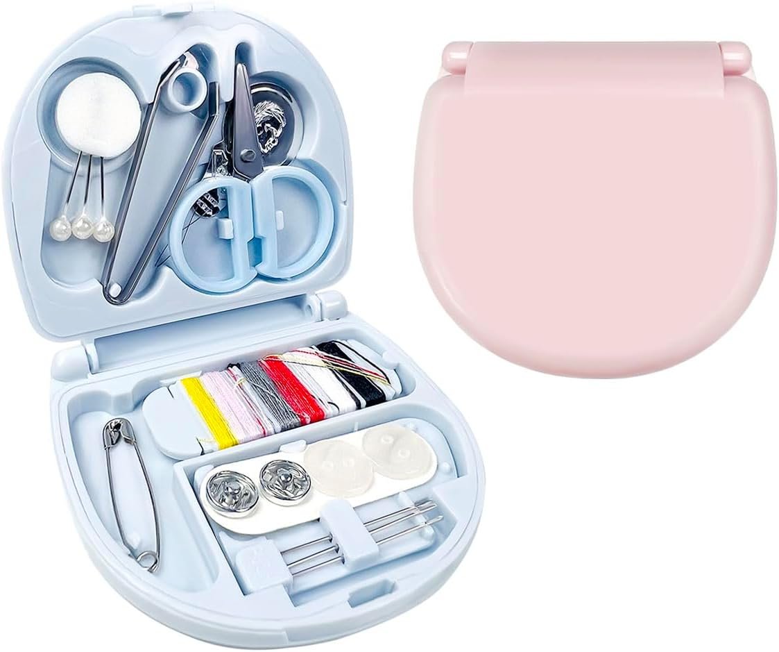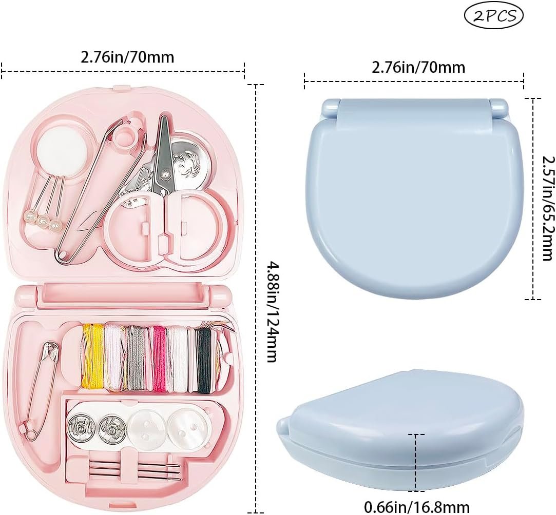 You will 2 pack travel sewing kit, with light pink and light blue colors; Each mini sewing kit includes all the necessary tools for basic sewing like needles, threads, needle threader, mini scissors, buttons, pin and tweezers