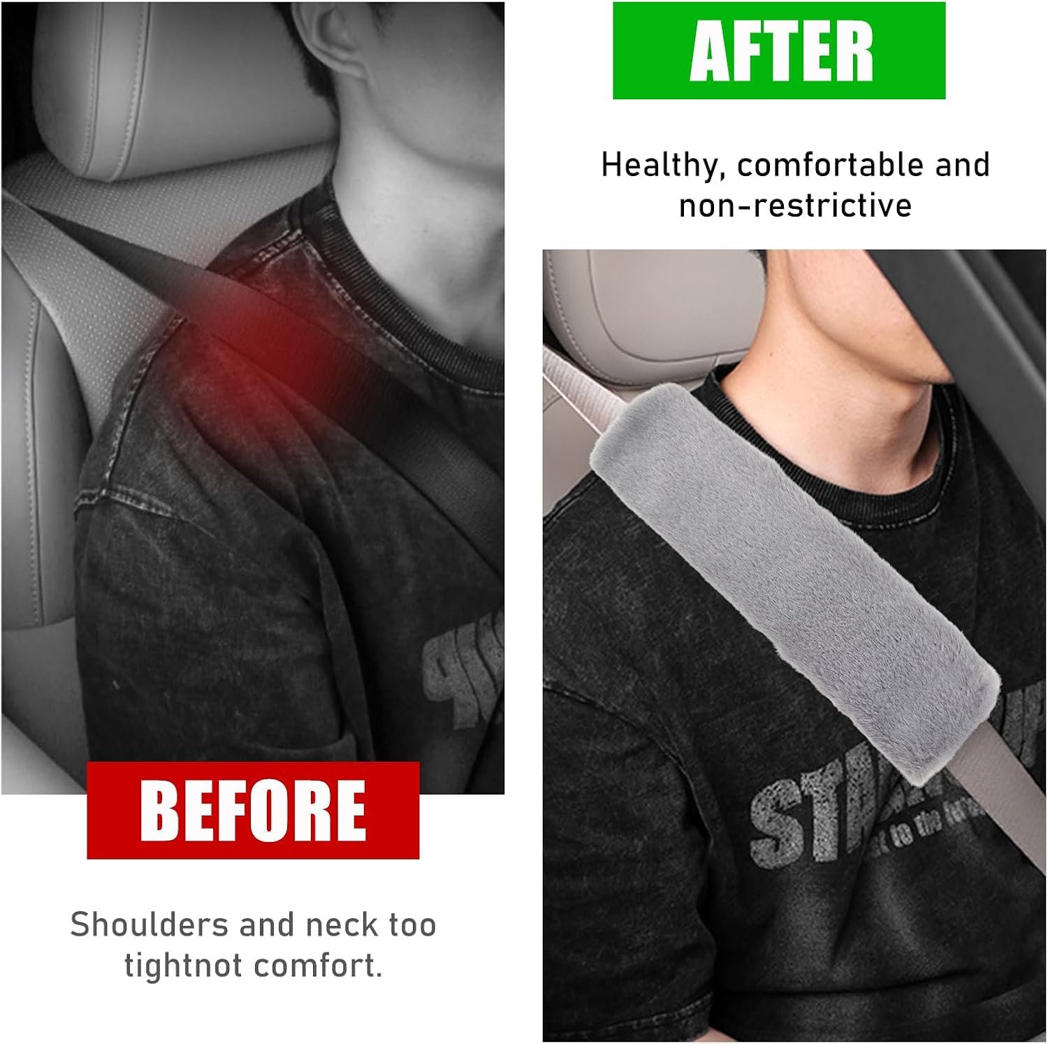 【Neck & Shoulder Protection】: This car seat belt cover can relieve the tightness and friction of the seatbelt on shoulder and neck, protecting the skin of your shoulders and neck. Its soft and fluffy surface is comfortable to touch, so that it can relieve your driving fatigue.