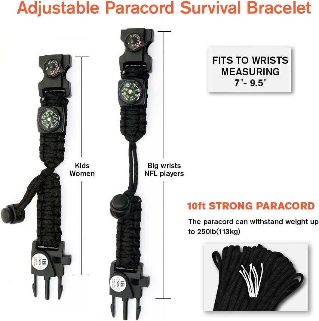 20 in 1 Survival Paracord Bracelet Adjustable Gear Kit with SOS LED Light, Fire Starter, Bigger Compass, Survival Whistle, Perfect for Camping, Hiking, Fishing