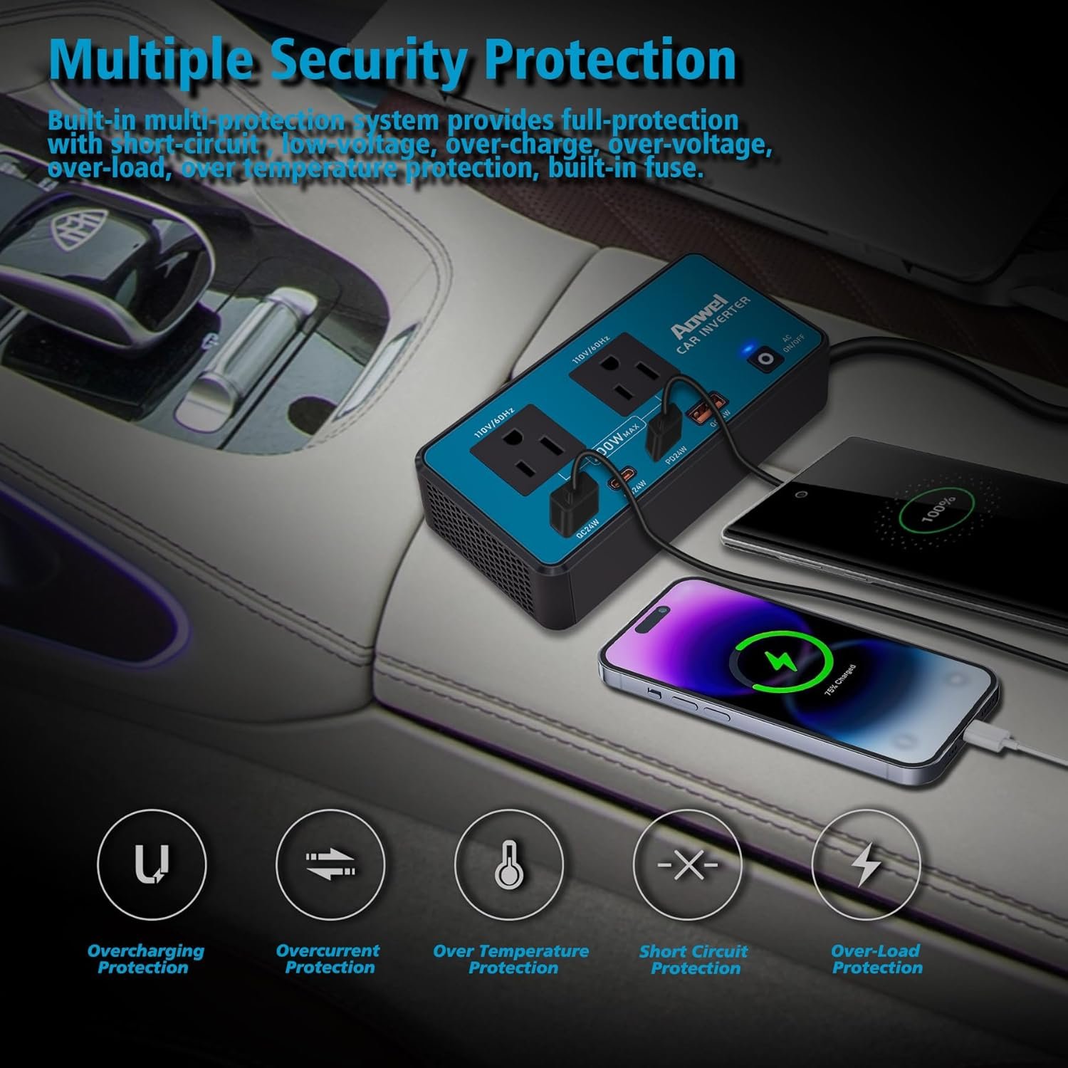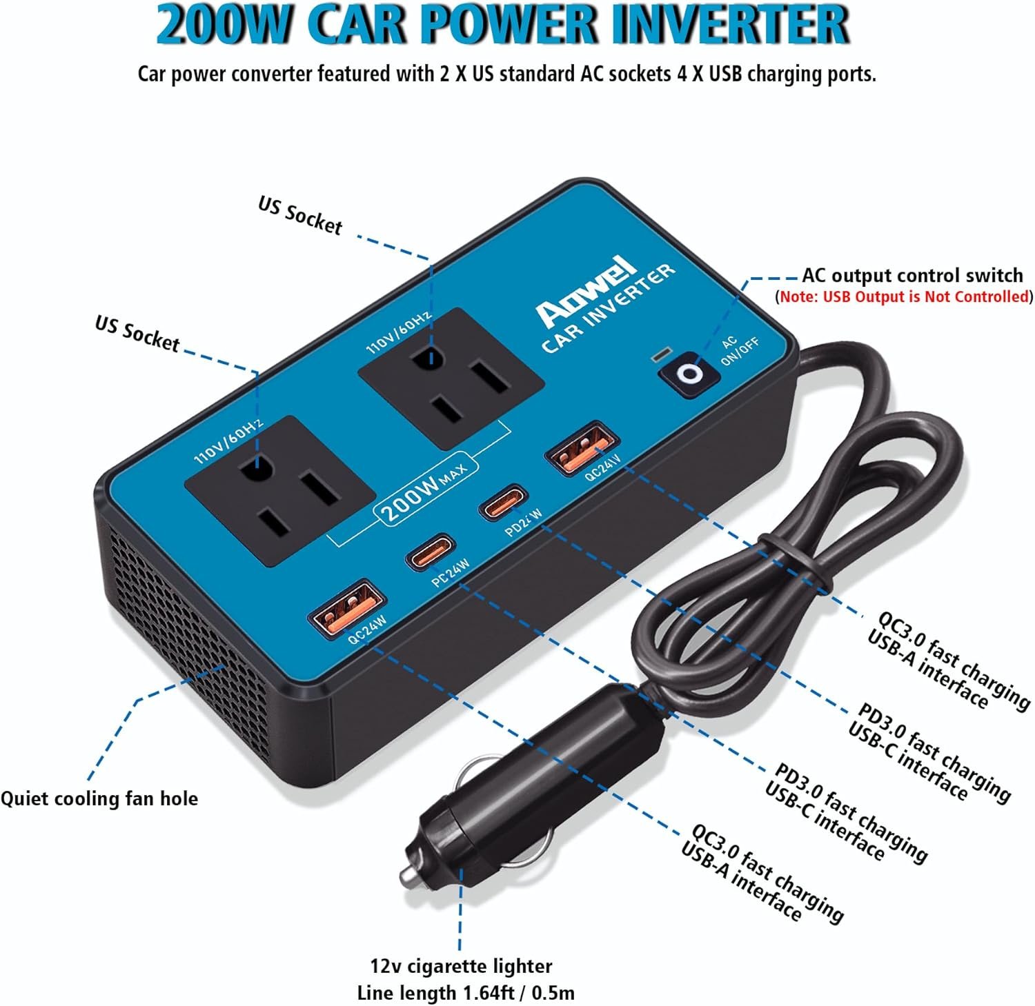 Aowel car power inverter converts 12v to 110v ac car plug in adapter outlet and has 2 plug outlet and 4 fast-charging USB ports. The AC output is a maximum of 200W, with each USB port capable of charging quickly at 24W simultaneously.