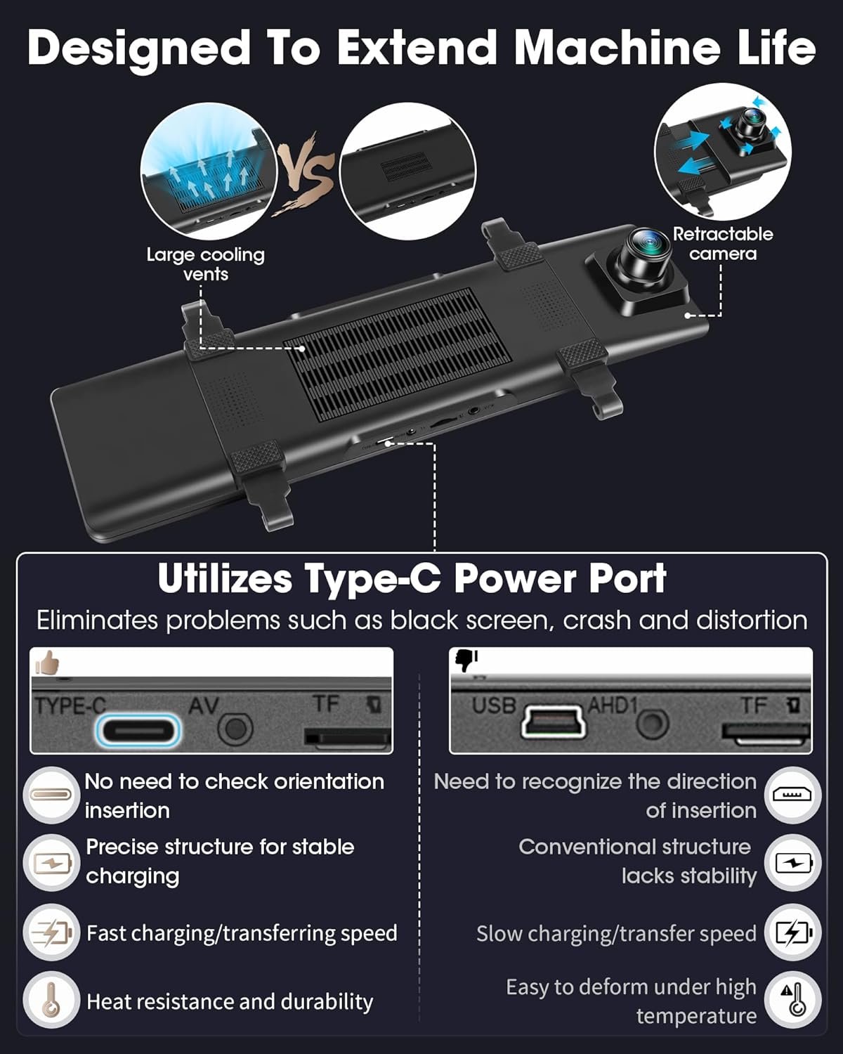 【Unique Designs Increase Practicality】The mirror camera for car increases the area of the cooling air outlet at the back to improve the cooling efficiency of the 4k backup camera mirror, avoid overheating inside the device and prolong its service life. The telescopic front camera can adjust the angle of the camera for more flexible monitoring.Type-C port power supply is more stable, there will be no power outages, repeated reboots, extends the service life of the dash cam front and rear mirror