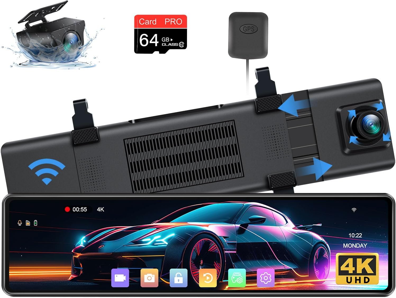 2025 Upgraded 12″ 4K Rear View Mirror Camera with WiFi,2160P Mirror Dash Cam Front and Rear Backup Camera for Cars & Trucks,WDR & HDR, Loop Recording, G-Sensor, Parking Monitor, 64GB Card & GPS