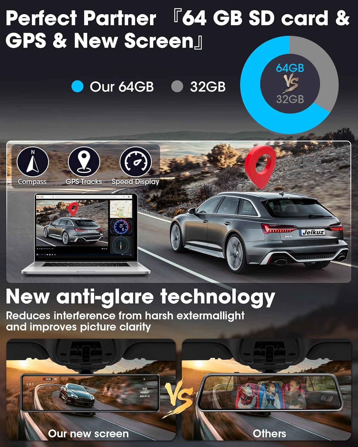 Jelkuz has specially prepared a 64 GB SD card. It can record twice as many video files as a regular 32G SD card, allowing you to store more video files and delete videos less often. When used with the 12-inch 4K ultra HD dual camera, it’s ready to use as soon as it arrives. The original memory card also works more smoothly. Rear view dash camera reduces malfunctions.