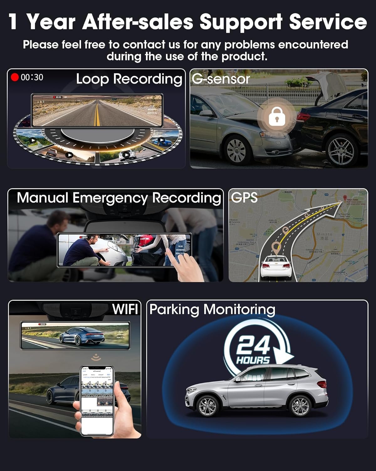 【1 Year After-Sale & Easy Installation & Multi-functional】The dash cam front and rear wireless is powered by the cigarette lighter socket, easy to install! Jelkuz provides one year after-sales service, please let me konw if you encounter any problems in the process of using it.The backup camera for car support multiple functions as a sweet assistant on your driving route: Loop recording, G-sensor, Parking monitor, WIFI,GPS etc