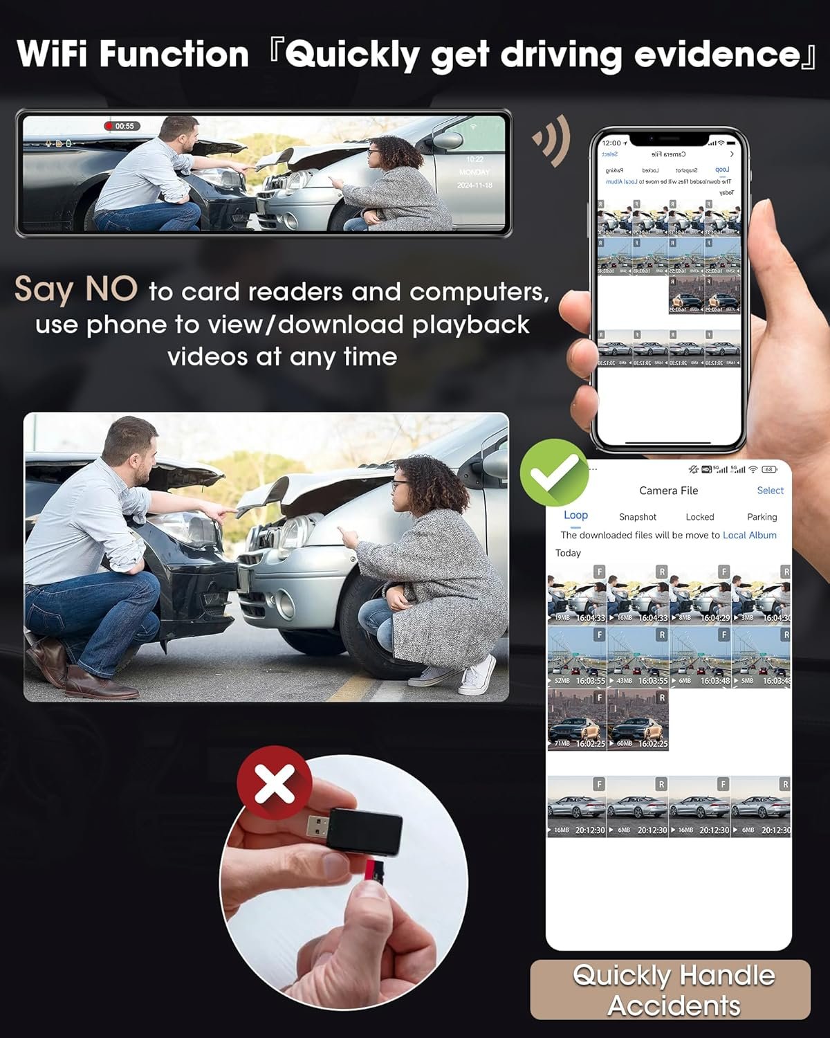 ●You can view the recorded files using only your phone! In the event of an accident, it saves you the trouble of having to look up the driving playback video on your computer or card reader.