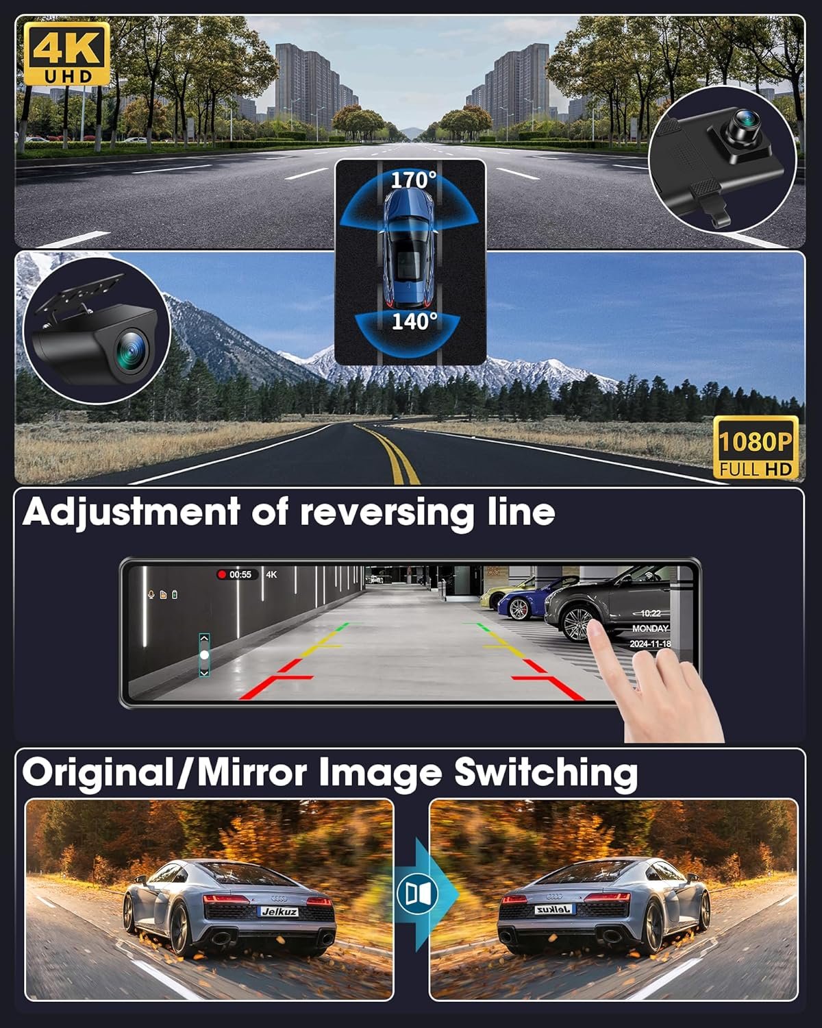 ●Front And Rear Camera Recording At The Same Time: Jelkuz rear view mirror camera adopts 4K+1080P ultra clear shooting technology to record smooth HD video. 8 Megapixels high pixel can perfectly capture the tiniest details such as license plate. Enjoy your trip with the peace of mind that comes with a solid and reliable mirror dash camera.