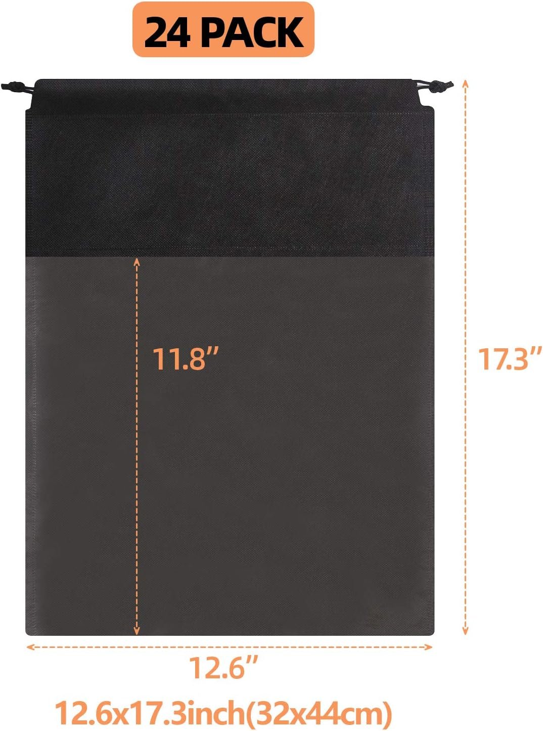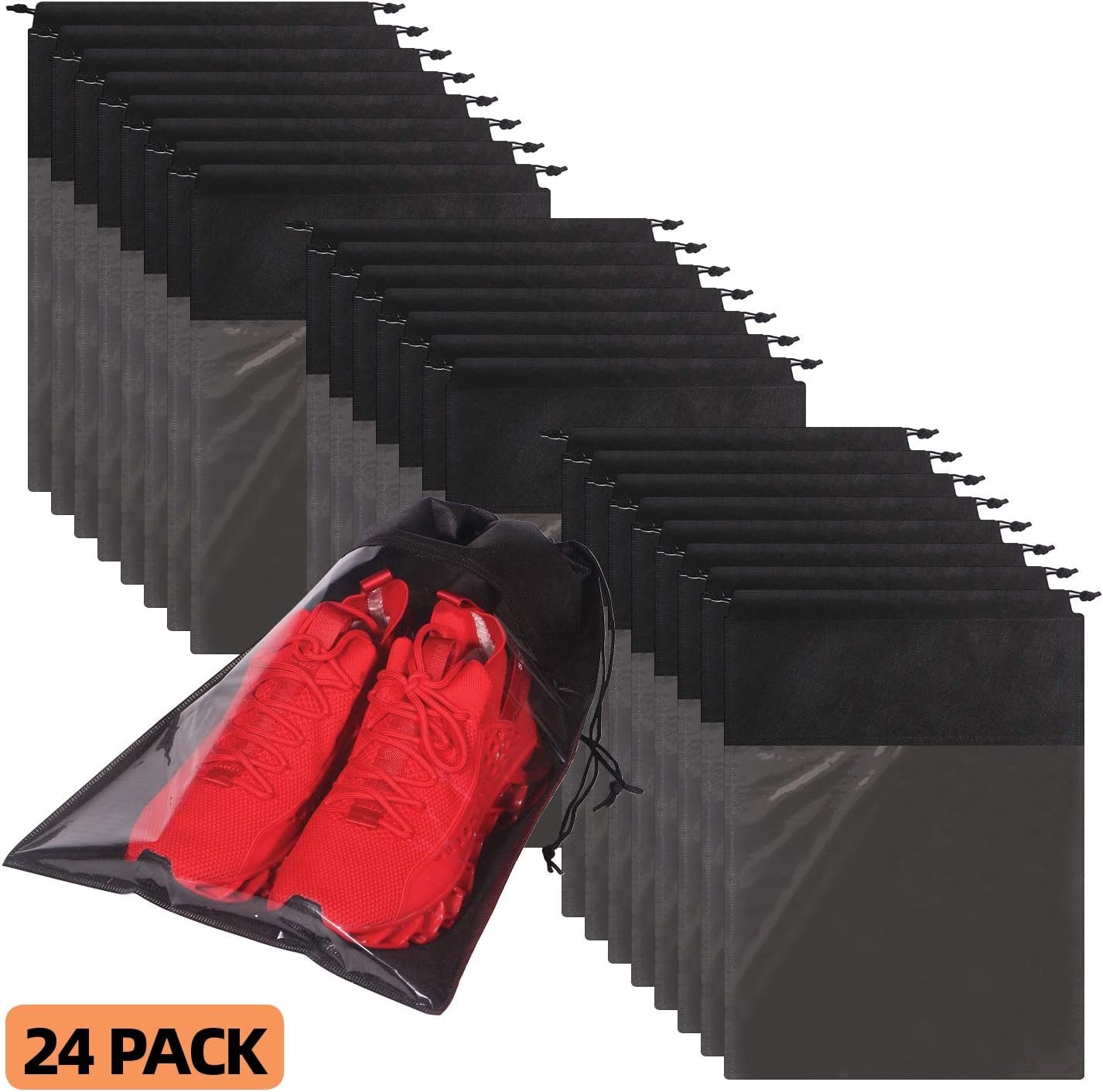 1.【SIZE&COLOR】Set of 24. Color: Black. Large Size: 12.6 inches x 17.3 inches. Perfect size for womens and mens shoes covers. Suitable for Slippers, flip flops, Sandals, leather shoes, dance shoes, kids shoes, hiking tennis golf shoes, purse, clothing, clothes, handbag etc. Ideal for home and travel Use. Separate your dirty shoes from laundry, shirts or other luggage essentials. 2.【STURDY MATERIAL】Made of non-woven fabric with thick rope for convenient organization, durable use. The travel shoe bags has foldable, lightweight and portable, convenient to use. Keeps your shoes well organized and dust free in the closet. 3.【TRANSPARENT WINDOW DESIGN】Easily and quickly identify the content in the Bags. The storage bag helps to keep purses and shoes clean, dust free, and organized. It can be applied as shoes bag for yoga class, running, dancing, exercises, travelling and so on. 4.【FUNCTIONAL & VERSATILE】 Not only fit for sneakers, dress shoes, high heel shoes and sandals, laundry, shirts, and many other luggage essentials; Also can be used as makeup bag, shoe accessories, space saving traveling bags, toiletry bag, packing bags, gym accessories, laundry bags travel, show bags, sport bags, drawstring christmas gift bags, carrying shoes storage organizer bag and for other uses. 5.【TRAVEL ACCESSORIES】These travel bags is great for travel! It helps you packing luggage conveniently and quickly, you don’t have to dig around for what you need. With these shoe bags, you can maximize your suitcase space.