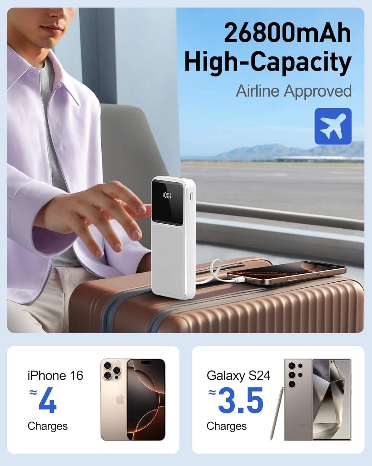 26800mAh Portable Fast Charger with Build in Cables, 22.5W Power Bank with PD 3.0+QC 4.0 LED Display, High Capacity Phone Battery Pack Tracel Essentials Compatible with iPhone Samsung Google, etc