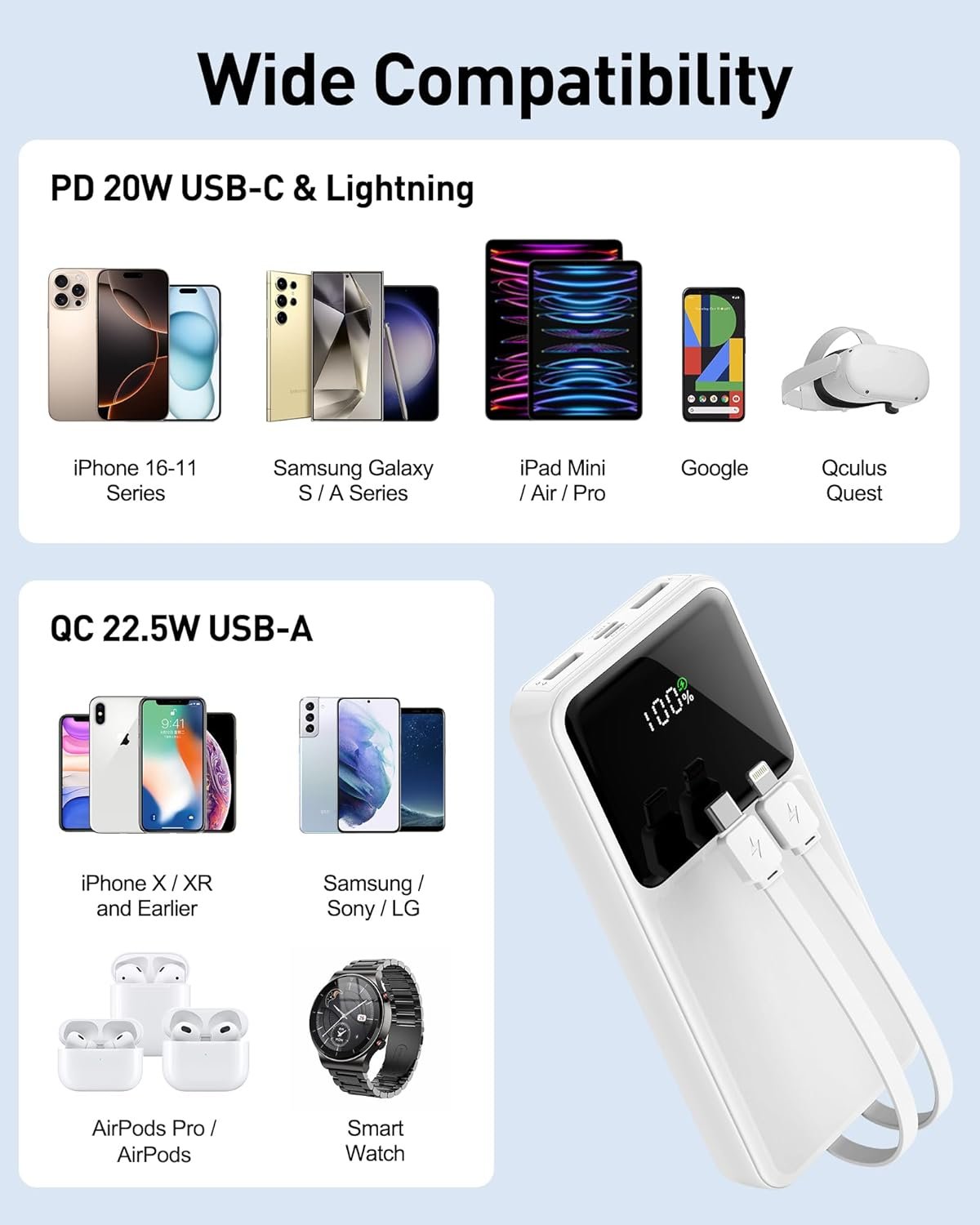 Universal Compatibility – Widely compatible with iPhone 16/15/14/13/12/11 series, iPad series, Samsung S23,S22,S21,S20 series and other cell phones, tablets or electronic devices. You will get 1*Portable Charger, 1*User Manual, our worry-free 36-month warranty, and friendly customer service.