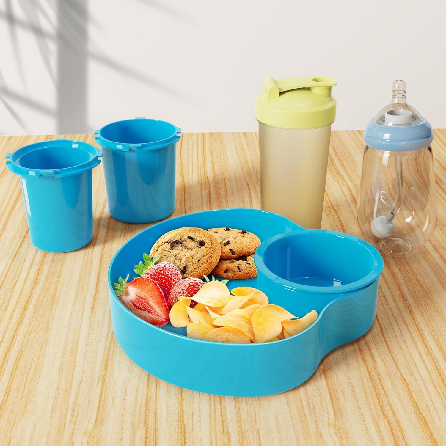 2PCS-Divider Structure and Splash-Proof Design: The divider structure design on the cup holder tray allows children to place water cups and snacks at the same time.