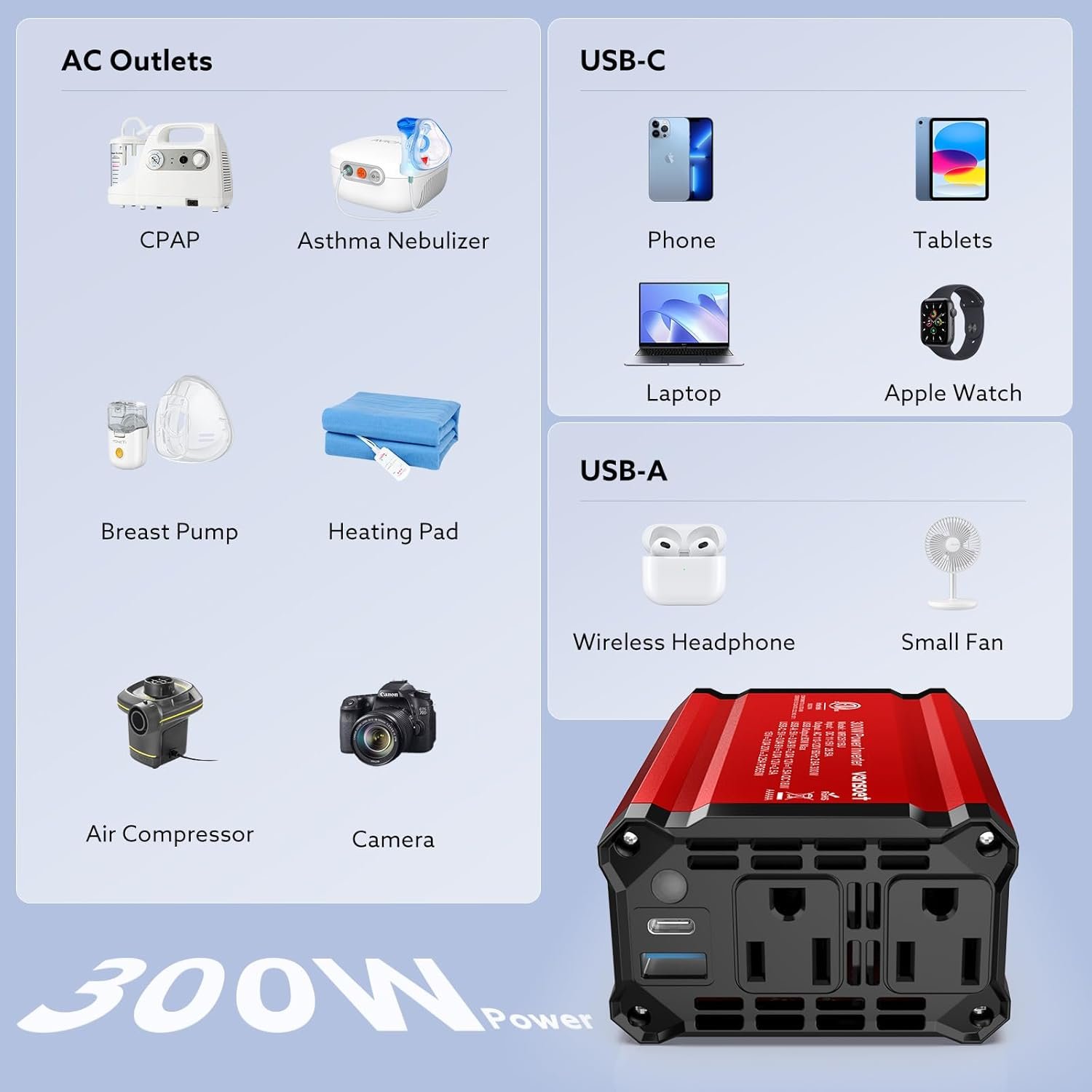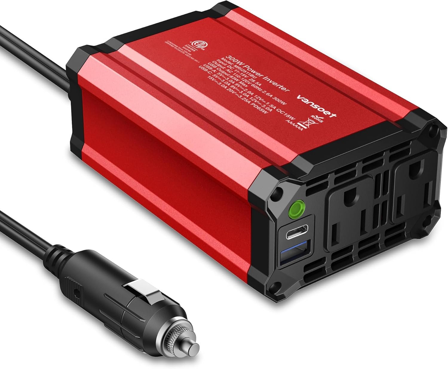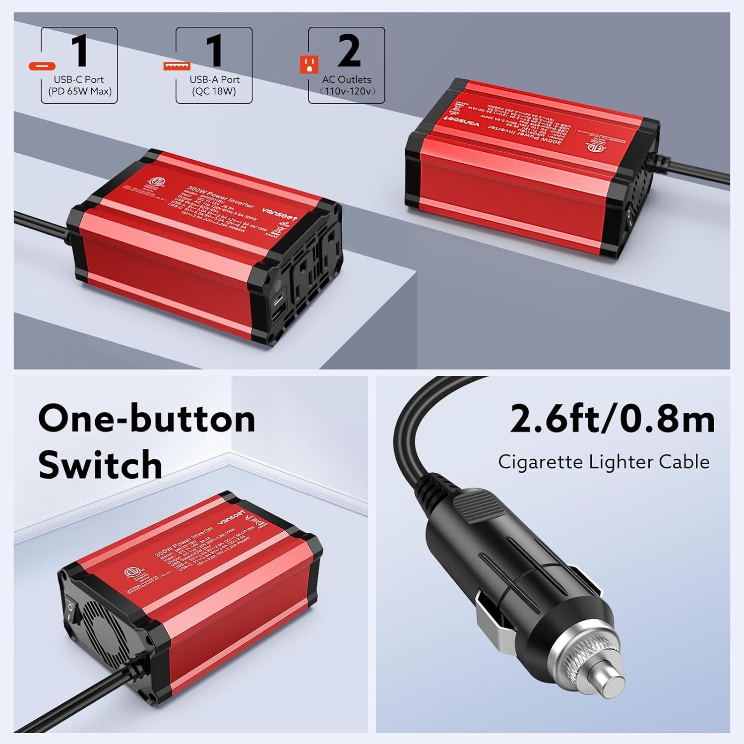 300W Power Inverter 12V DC to 110V AC, vansoet Fast Car Charger Plug in Adapter Outlet with PD 65W USB-C&QC 18W Port, Portable Power Converter for Laptop Vehicles Camping Road Trip Essentials Adults